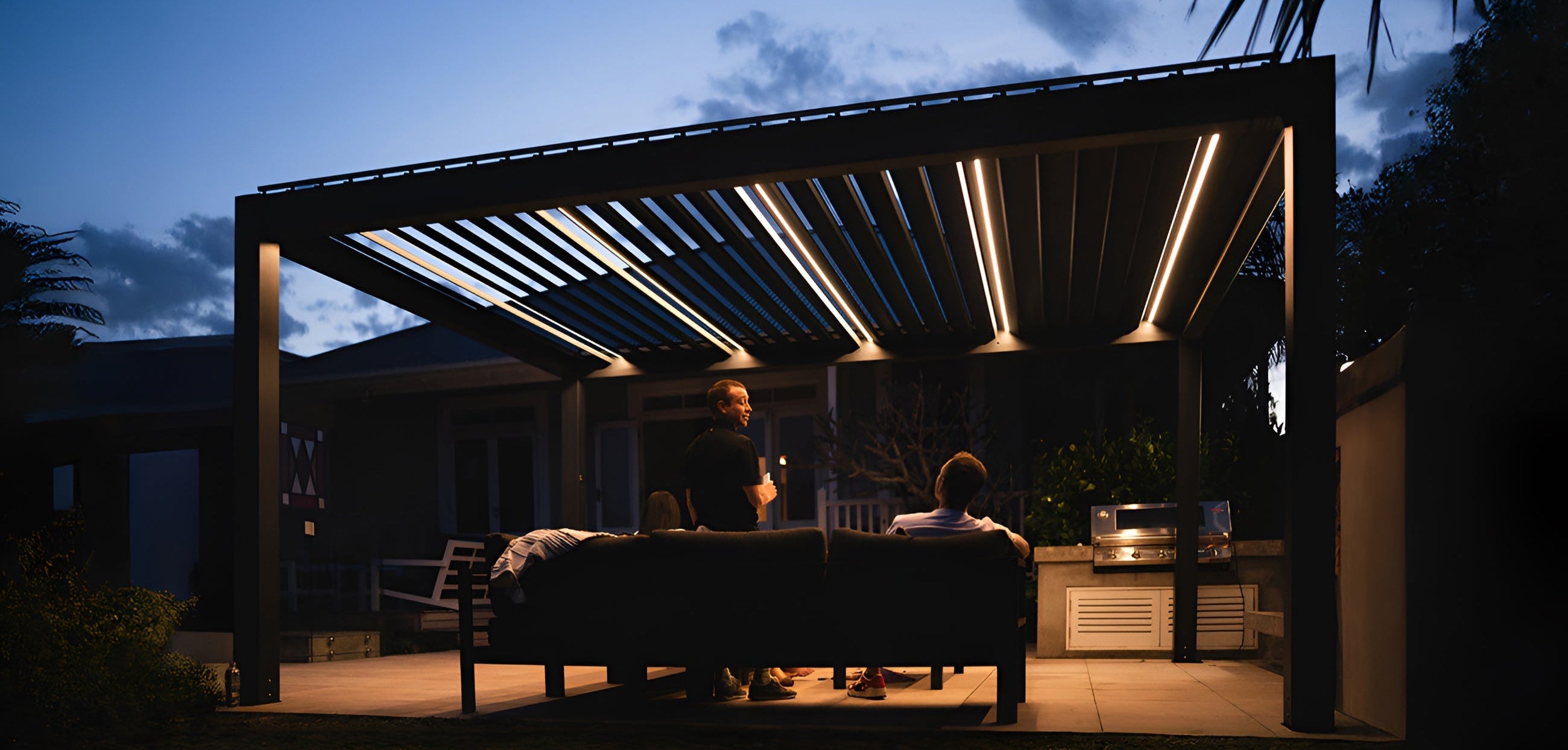 Close the louvres and the roof forms a continuous cover that channels rainwater into the frame, helping keep the area underneath usable in wet weather.