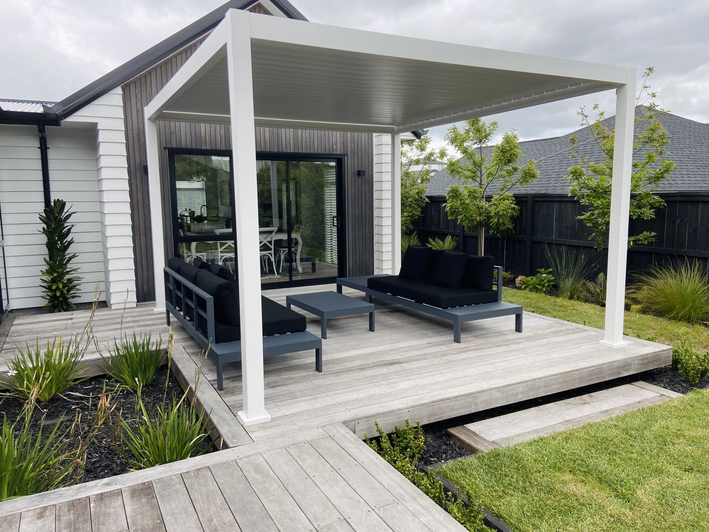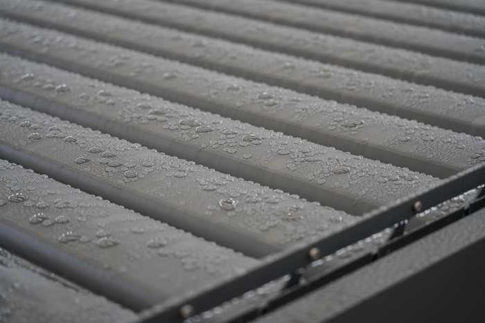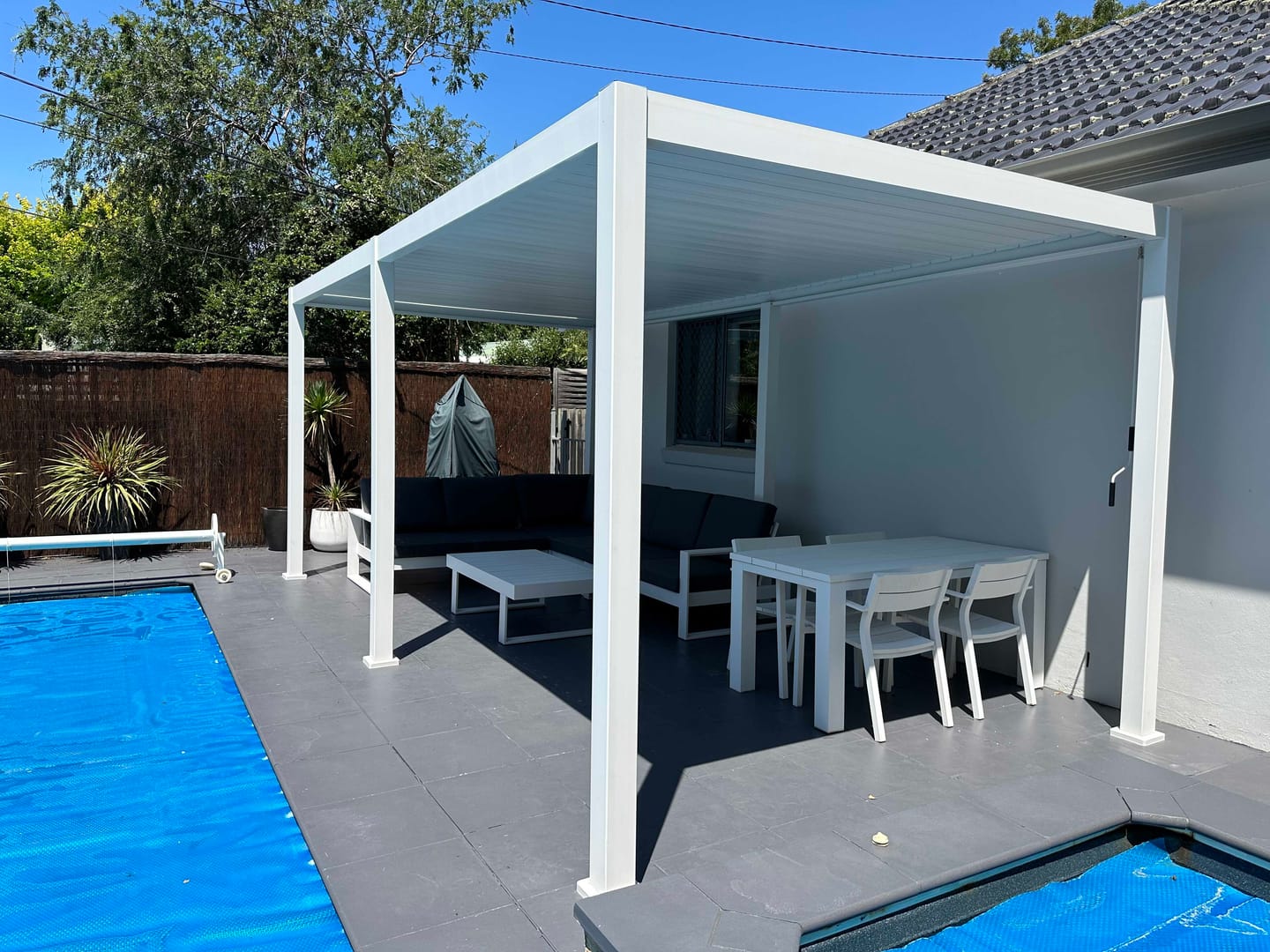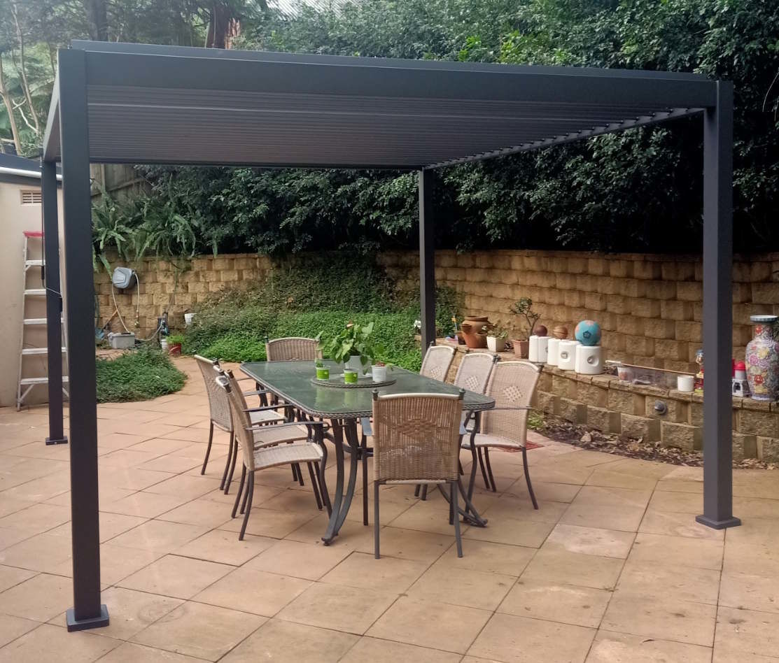 Close the louvres and the roof forms a continuous cover that channels rainwater into the frame, helping keep the area underneath usable in wet weather.