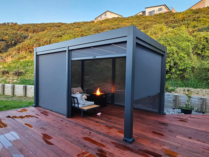 Optional side screens or glass doors provide extra protection, keeping your outdoor space comfortable and secure all year round.